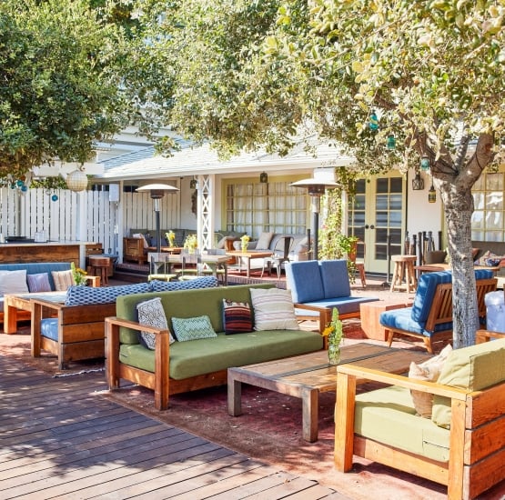 Everything about the laidback space lends itself to easy conversation and relaxed fun: the mismatched couches draped with Mexican blankets, surf mementos, glowing lanterns hanging from the trees and drop-dead gorgeous ocean views.