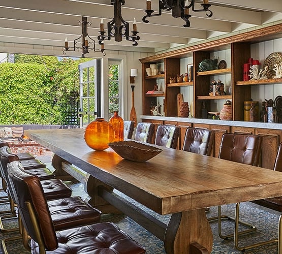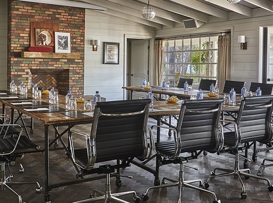 This is our boardroom with Southern California beach-style flair, set in The Bungalow cottage lounge. Opening onto the garden patio with lots of outside light, the space feels relaxed and open. The central feature is the large handcrafted solid oak dining table, lit by wrought-iron chandeliers. French doors lead off to the private brick patio with private bar and comfortable seating around a fire-pit.